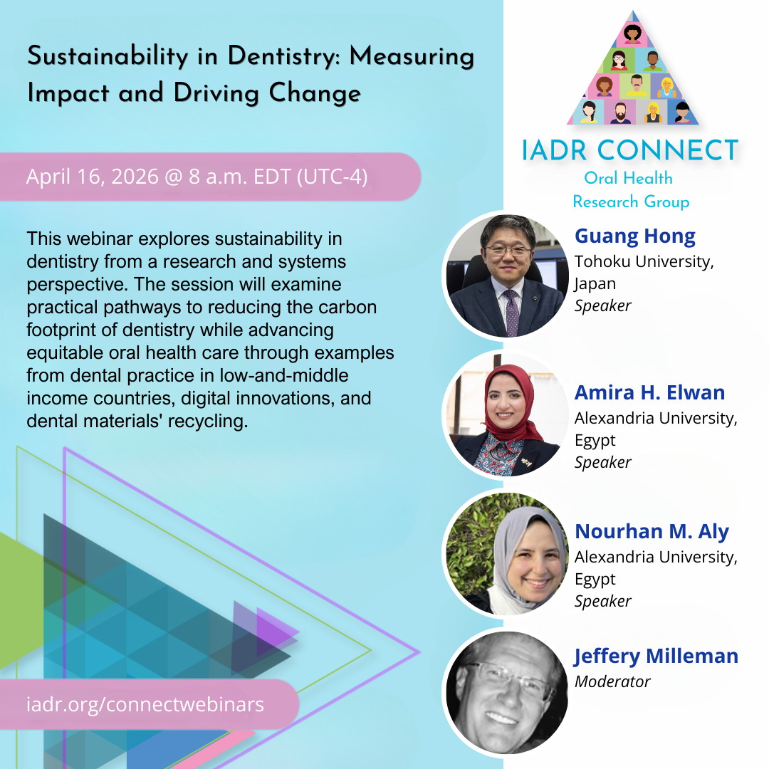 This webinar explores sustainability in dentistry from a research and systems perspective. The session will examine practical pathways to reducing the carbon footprint of dentistry while advancing equitable oral health care through examples from dental practice in low-and-middle income countries, digital innovations, and dental materials' recycling.