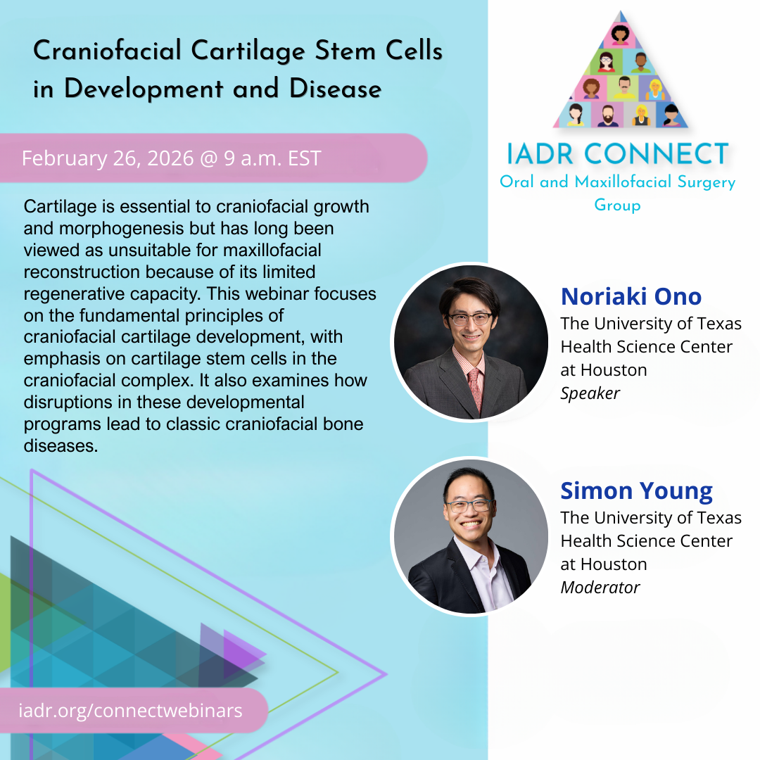 Cartilage plays a central role in the growth and morphogenesis of the craniofacial skeleton. Despite its critical functional importance, craniofacial cartilage has traditionally been considered outside the scope of maxillofacial reconstruction due to its limited intrinsic regenerative capacity. This webinar aims to deepen participants’ understanding of the fundamental principles governing cartilage development, with a particular focus on cartilage stem cells within the craniofacial complex. The session will also explore how disruptions in cartilage developmental programs contribute to the pathogenesis of archetypal craniofacial bone diseases.